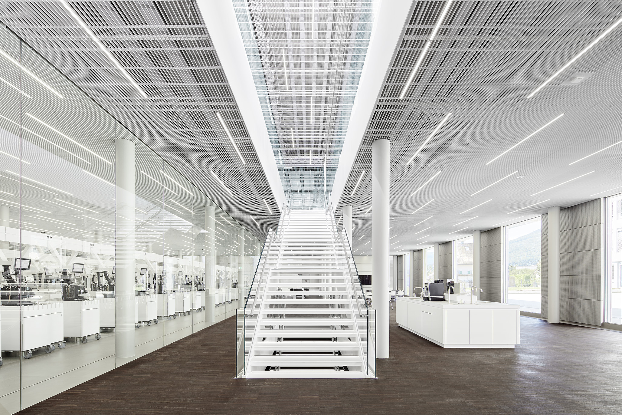 Die komplexen Aufbauten der Anlage sind mit weissem Blech verkleidet. So erscheint die Anlage schlicht und rückt das wesentliche ins Zentrum; den Kaffeevollautomaten im Dauertest.